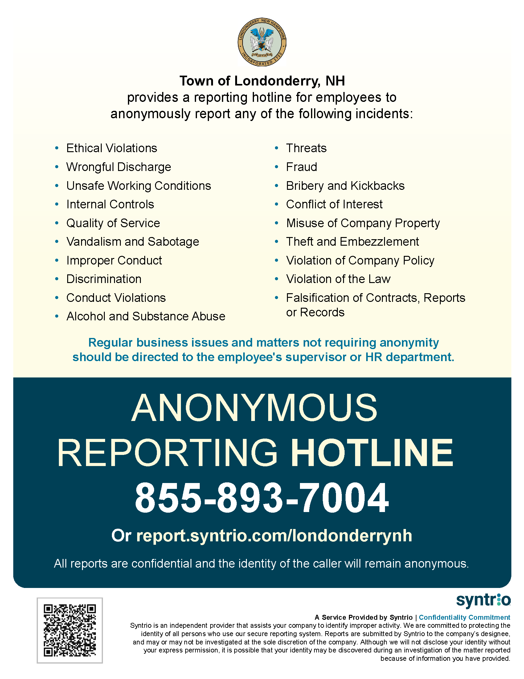 To submit a complaint, please use our Anonymous Complaint Form hosted by Syntrio Lighthouse Services or call 855-893-7004. You may choose to remain anonymous or to have your contact information included. The Town will act on anonymous complaints according to its Anonymous Hotline Policy; however, we may be limited in our ability to investigate those concerns depending upon the information provided.