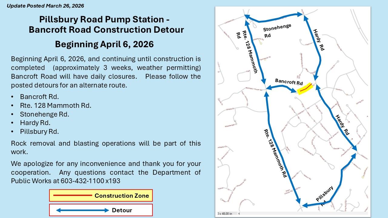 Any questions contact the Department of Public Works at 603-432-1100 x193